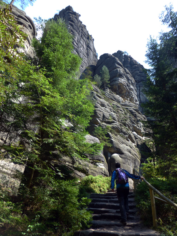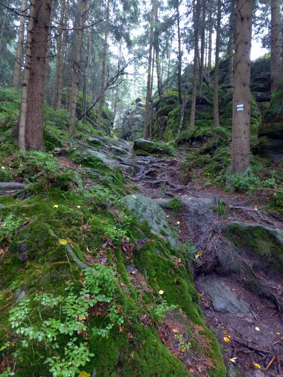 Comenzamos a ascender por el sendero azul y al cabo de uno 500m, nos cruzamos con un sendero amarillo que corresponde a la Garganta del Lobo. Según el mapa, este sendero une Teplice con Adrspach y es el que el día anterior dejamos a la mitad porque no sabíamos hacia dónde conducía.
