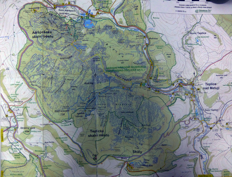 En la entrada a Teplice también nos dieron un mapita con una ruta de 6 km marcada. Sin embargo, nosotros habíamos visto por internet que podíamos alargarla un poco más, así que rescatamos el mapa grande que compramos el día anterior, y nos fuimos guiando por él. El resultado final fueron unos 18 km en 5h con un combinado de lluvia y sol bastante molesto, pero mereció bastante la pena por los paisajes tan espectaculares que vimos.