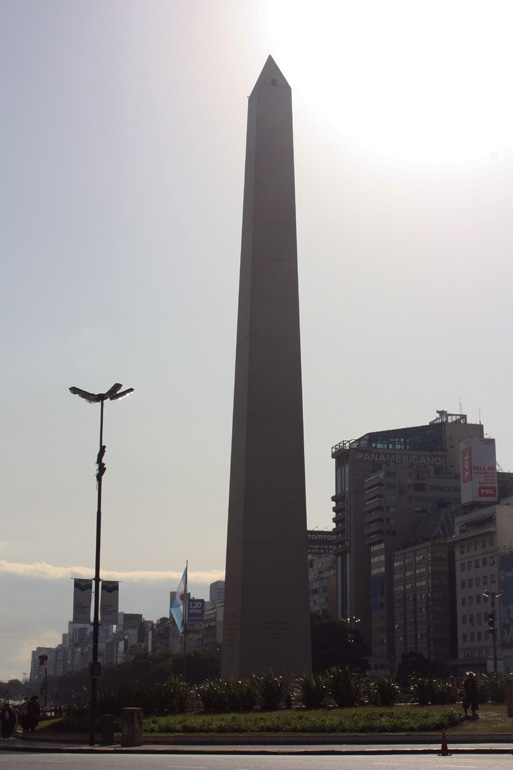 Lo primero que hice nada más llegar a la capital federal fue buscar su famoso Obelisco. Y allí, en mitad de la enorme Plaza de la República y dando salida a las dos arterias principales de Buenos Aires, Corrientes y 9 de Julio, me encontré con el Obelisco. Una pirámide de piedra de casi 68 metros de altura, obra del arquitecto Alberto Prebisch. Fue inaugurada en 1936 con motivo del cuarto centenario de la fundación de la capital federal.
