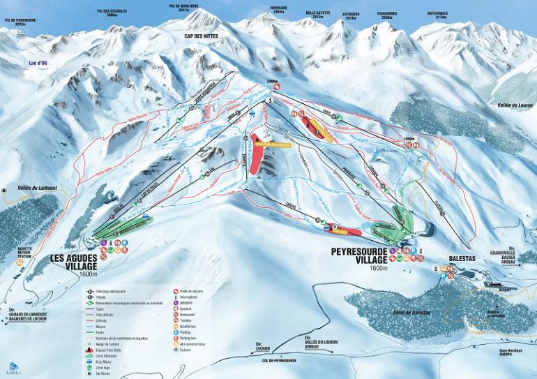 Localizada en pleno corazón de los Pirineos, en la región de Midi-Pyrenees, Peyragudes está dividida en dos sectores que antaño fueron dos estaciones diferentes: Peyresourde, al Oeste, y Les Agudes, al Este. La unión de ambas la ha convertido en un dominio bastante más completo y atractivo para los amantes de los deportes de nieve. En total cuenta con 60 km esquiables distribuidos en 50 pistas: 5 dedicadas a debutantes (verdes), 22 para esquiadores con un poco más de soltura (azules), 20 destinadas a esquiadores de nivel intermedios (rojos) y 4 enfocadas a los más experimentados (negras).