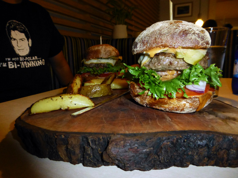 Las hamburguesas del restaurante Mosaiik están cocinadas en el horno de piedra y servidas con patatas gajo. Además, cuidan mucho la presentación, pues en lugar de servirlas en platos, lo hacen en trozos de tronco de árbol, lo que potencia aún más ese sabor a horno de leña (aunque solo sea psicológico).