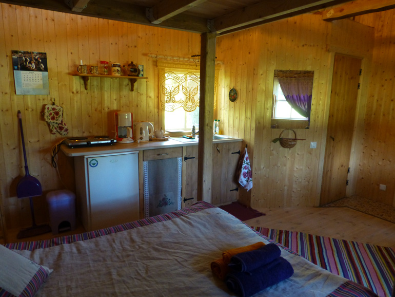 Nuestra casita de madera contaba con dos plantas diáfanas. En la de abajo estaba la cama de matrimonio, una mesita con dos sillas, una mini cocina y el servicio, que era bastante chiquito pero al menos el agua salía caliente. En la planta de arriba, que era abuhardillada, había otra cama de matrimonio.
