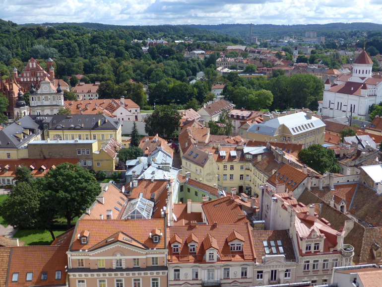 Esta iglesia ofrece unas magníficas vistas de la capital lituana. Desde arriba se alcanza a ver todo el centro de Vilna. Pero lo que más llama la atención son sus perfectos, cuidados y bien alineados tejados anaranjados. Todos ellos anidados en la espesura verde de los parques Kalnu y Sereikiskiu.