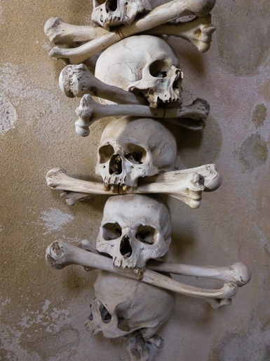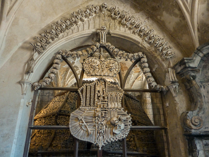 Guirnaldas de calaveras, columnas decoradas con fémures y una enorme lámpara de araña con al menos un ejemplar de cada hueso humano. Así es el Osario de Sedlec, una capilla de huesos a 2,5 km de Kutná Hora. Se cree que este tétrico lugar es una tumba común donde yacen los huesos de unas 40.000 personas. Todos están estratégicamente colocados para decorar el santuario, no como en el osario de Brno, que están simplemente almacenados.