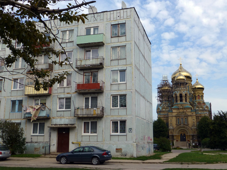 El distrito de Karosta es un barrio fantasma a unos 4 km del centro de Liepāja. Pero no por estar deshabitado, porque vimos gente que vive allí, sino porque es bastante tétrico. La mitad de las casas son angostos bloques soviéticos abandonados y medio derruidos, y la otra mitad están habitados aunque su aspecto no es mucho mejor.