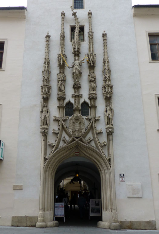 Es el edificio profano más antiguo de la capital de Moravia y fue la sede del ayuntamiento de Brno desde mediados del siglo XIV hasta 1935. Lo más destacado de este edificio es su precioso portal gótico. Llama la atención porque la torreta principal, obra del arquitecto Anton Pilgram, está inclinada hacia un lado. Cuenta la leyenda que esto es así porque el ayuntamiento no pagó al constructor la suma acordada. Y este, para vengarse, decidió dejar inclinada la torreta que está justo encima de la estatua de la Rectitud.