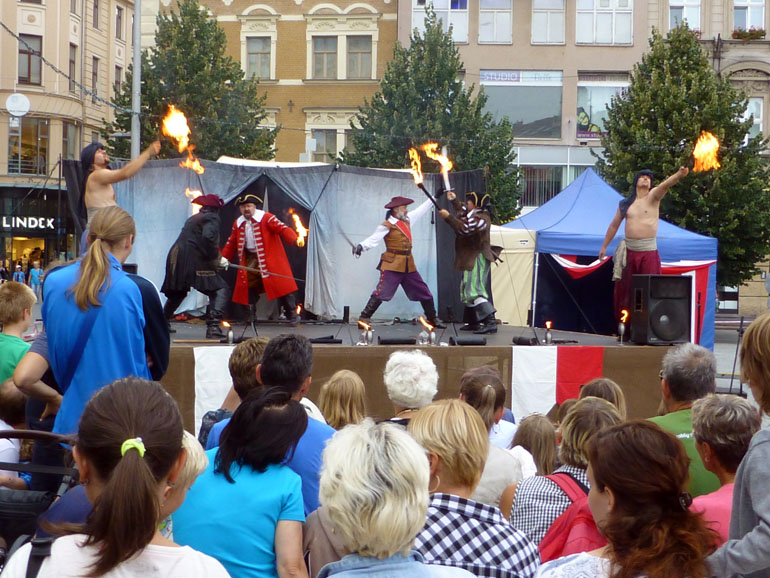 Por lo que intuimos de la actuación, porque no entendíamos nada, dedujimos que lo más reseñable de la victoria fue la forma en la que la consiguieron. Resulta que el general sueco que asediaba Brno, cansado ya por la prolongada contienda contra la ciudad, anunció que si no vencían a medio día, abandonarían la lucha. Cuando al día siguiente la ciudad de Brno estaba a punto de rendirse, el campanero de la catedral de San Pedro y San Pablo adelantó las campanadas del medio día a las once de la mañana. El general sueco, fiel a su palabra, cesó el combate y se retiró. Desde ese día, las campanas de la catedral tocan siempre doce campanadas a las once de la mañana.