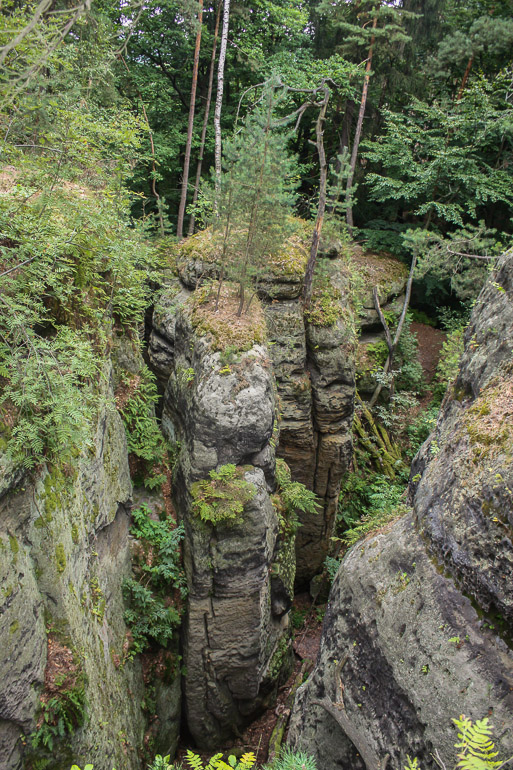 El siguiente punto es probablemente la parte más atractiva de la senda. Se trata de un laberinto de roca (Bludiště) formado por bloques de arenisca en forma de “chimenea”. Una de las zonas se puede ver dese arriba y luego hay que recorrerlo a pie.