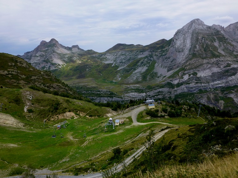 Superado el trance, al otro lado del túnel nos recibe el precioso valle de Soussouéou. Los 10 km de trayecto en tren discurren tranquilos al filo de la ladera de la montaña. Desde aquí el paisaje se presenta como un lienzo salpicado de verdes prados y recortado por los picos de las montañas. El cuadro lo completan las marmotas, los sarrios, las vacas pastando a lo lejos e incluso algún telesilla. En invierno este valle se tiñe de blanco y se transforma en la pequeña estación de esquí de Artouste.